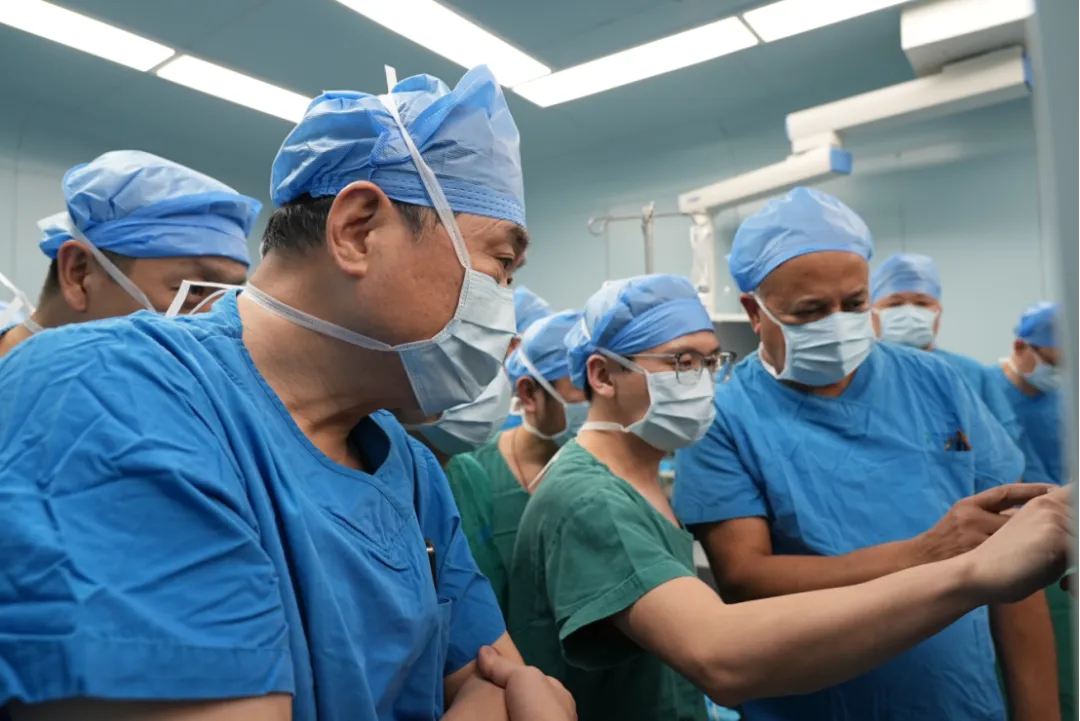 董家鸿院士(左一)和美方专家Tarek Hassanein(右一)共同指导黄鑫医师主刀手术(中)