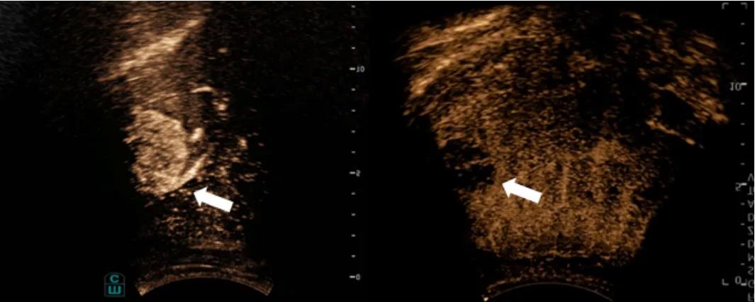 右图为病灶治疗后超声造影显像情况