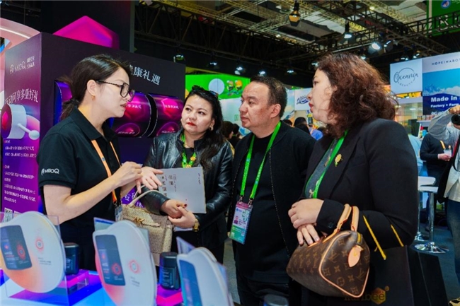 进博会场,MitoQ工作人员向参会观众讲解MitoQ产品专利科技