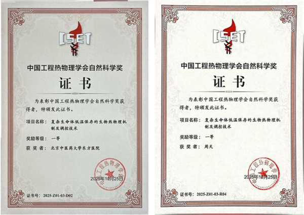 近日,北京中医药大学第二临床医学院(东方医院)周天主任医师团队与中国科学院理化技术研究所饶伟研究员团队联合以“复杂生命体低温保存的生物热物理机制及调控技术”项目,荣获中国工程热物理学会科学技术奖自然科学奖一等奖。该奖项是我国工程热物理领域最高学术荣誉,旨在表彰领域内具有重大科学发现、引领学科发展的原创性成果,本次获奖项目填补了复杂生命体低温保存的生物热物理领域理论与技术空白,为我国器官移植及再生医学、恶性肿瘤精准治疗的发展奠定了坚实基础。