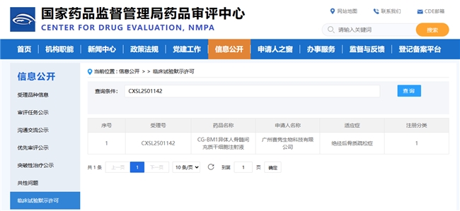 3月24日,国家药品监督管理局药品审评中心官网显示,广州赛隽生物科技有限公司(以下简称“赛隽生物”)自主研发的异体人骨髓间充质干细胞注射液(管线代号:CG-BM1)已正式获得临床试验默示许可,拟开发适应症为绝经后骨质疏松症(PMOP)。